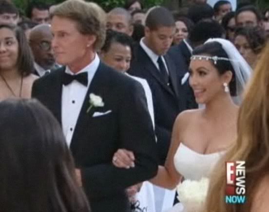 Here's the first uber-grainy full pic of Kim walking down the aisle in her custom Vera Wang strapless gown with her step-father Bruce Jenner: